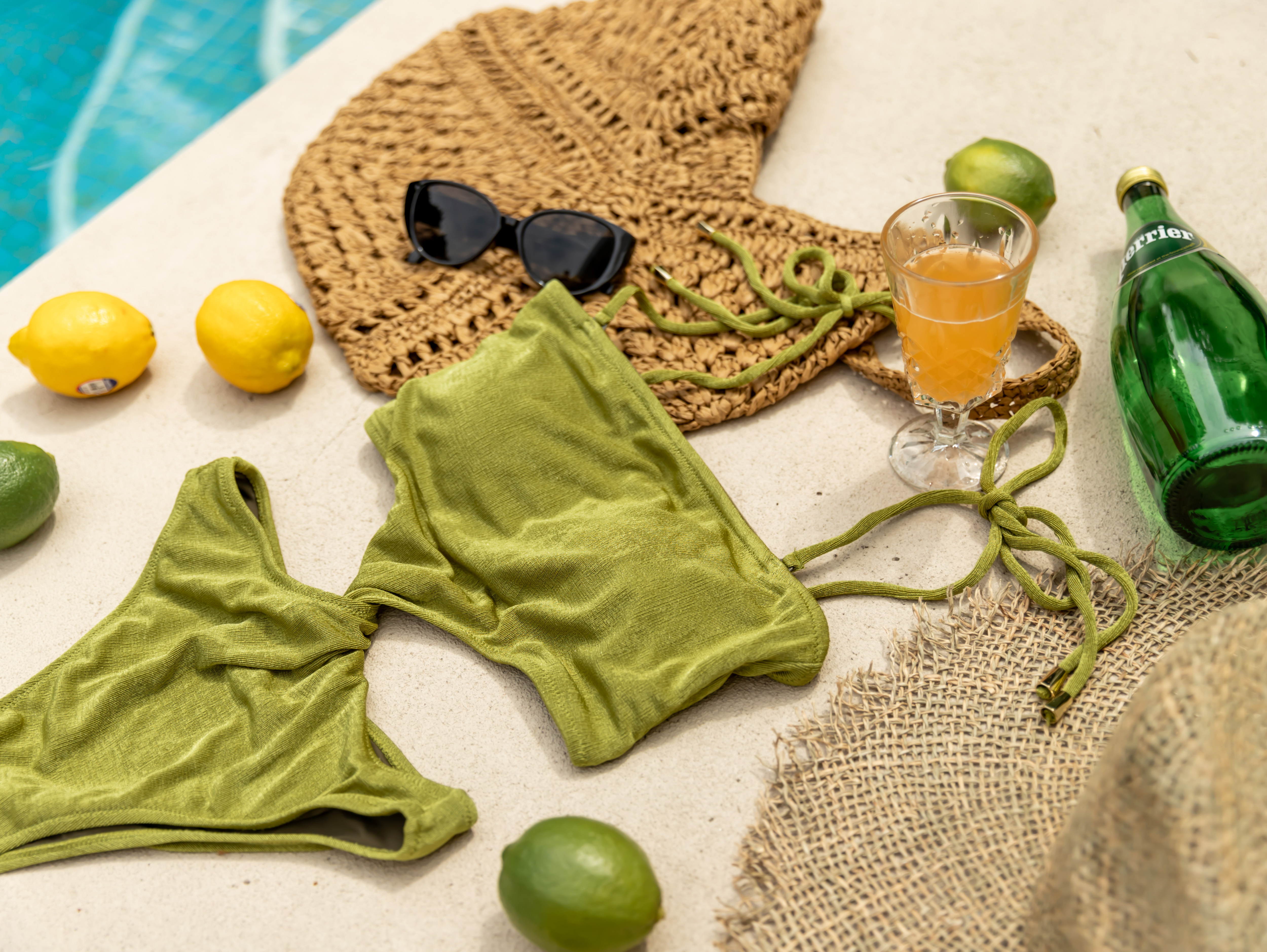 The swimsuit lays flat without the twist style. To achieve the model's twisted look, simply twist the upper body once.