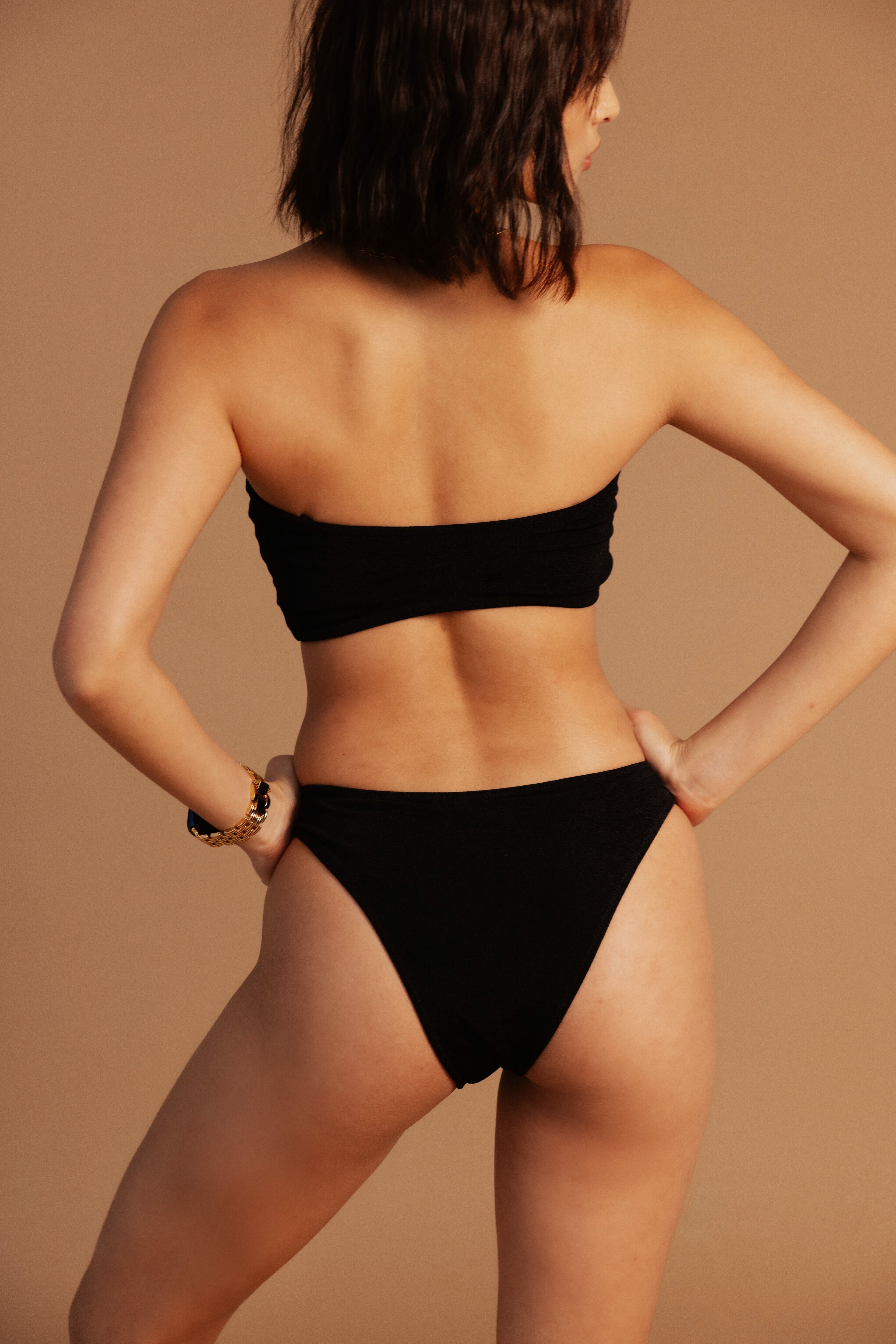 泳衣平放為無扭結造型,上身平轉一圈即可有model扭結穿搭造型